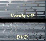 DVD är mycket lik en vanlig cd men har mycket större lagringskapacitet (ungefär 4,7 Gb) det är ungefär 7,5 gånger en vanlig cd. En dubbelsidig DVD med två lager på var sida kan innehålla ända upp till 17 Gb information som motsvara mer än 26 cd skivor. Dataöverföringshastigheten är 10,08 megabit/sekund. Bilden visar skillanden på storleken |