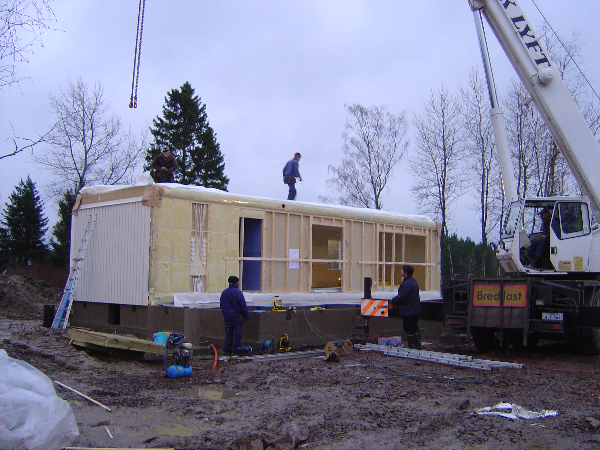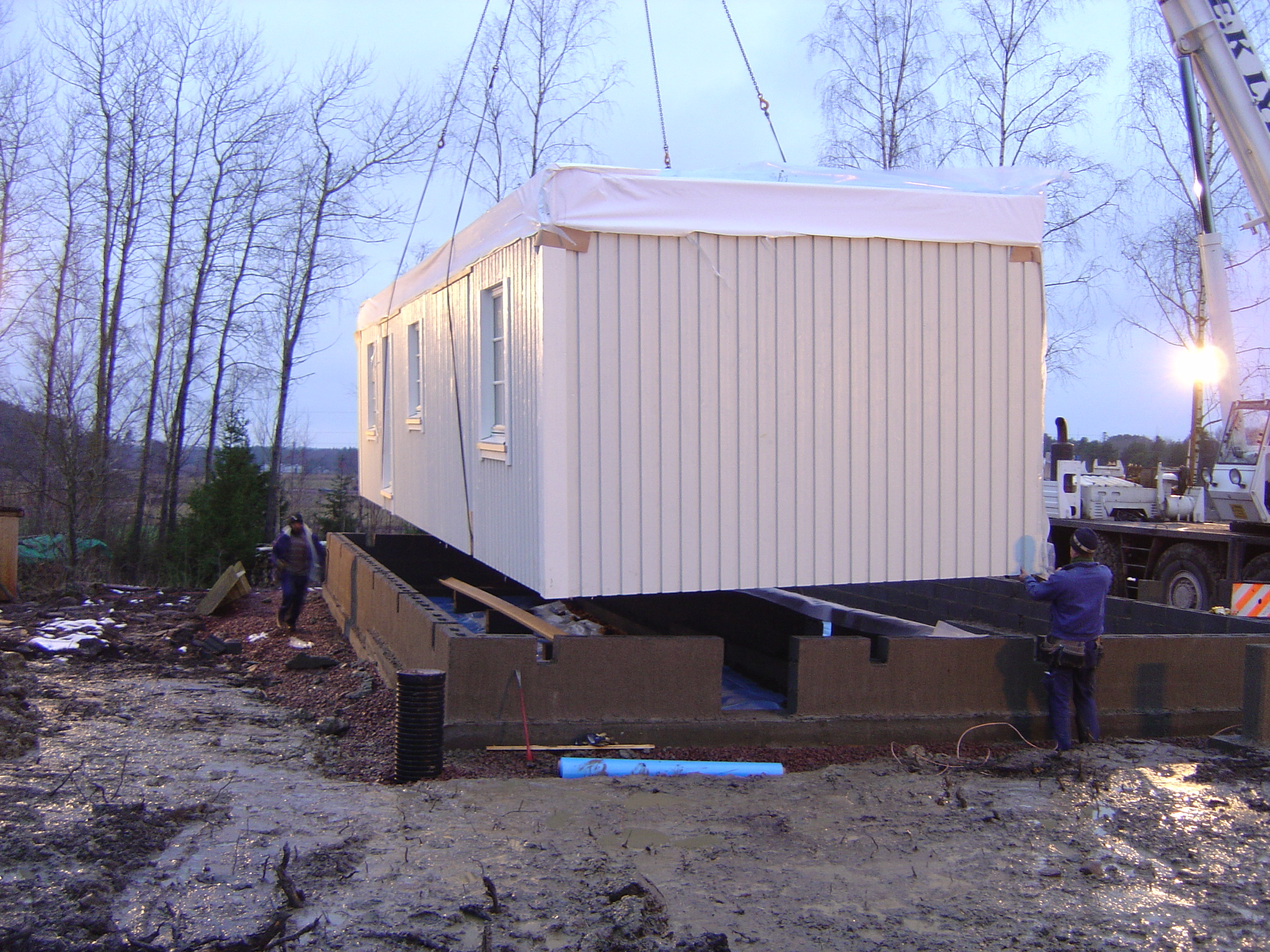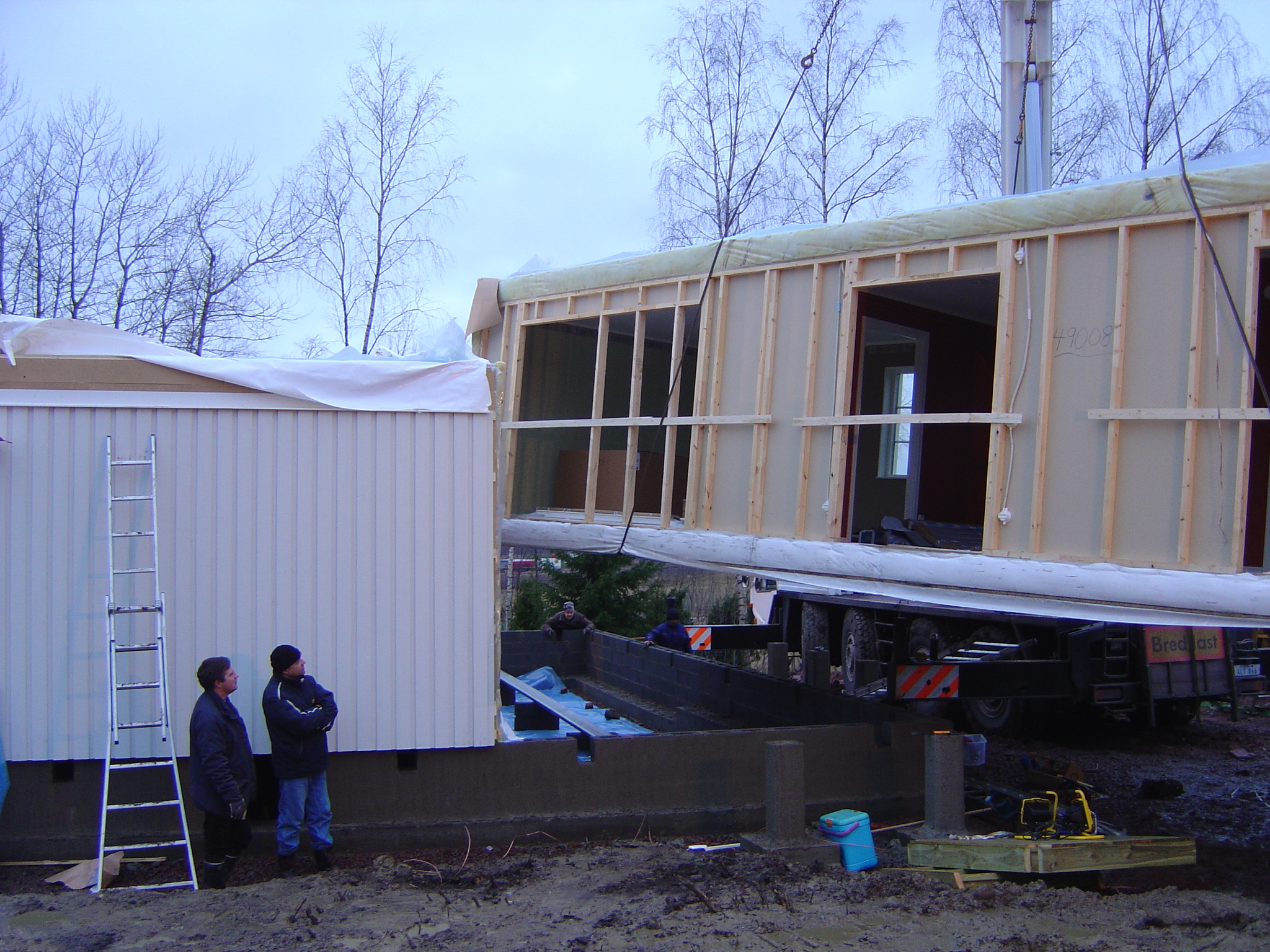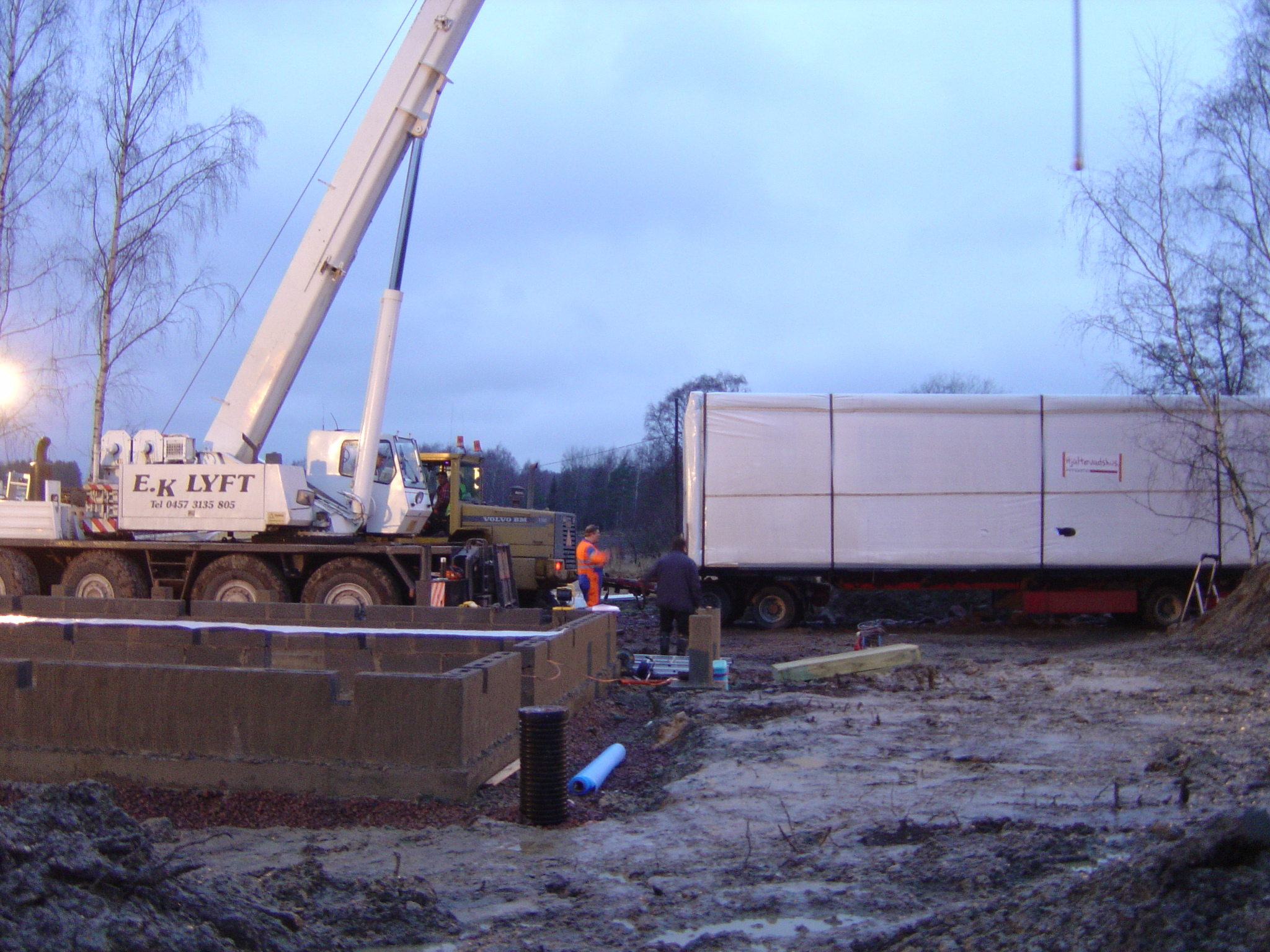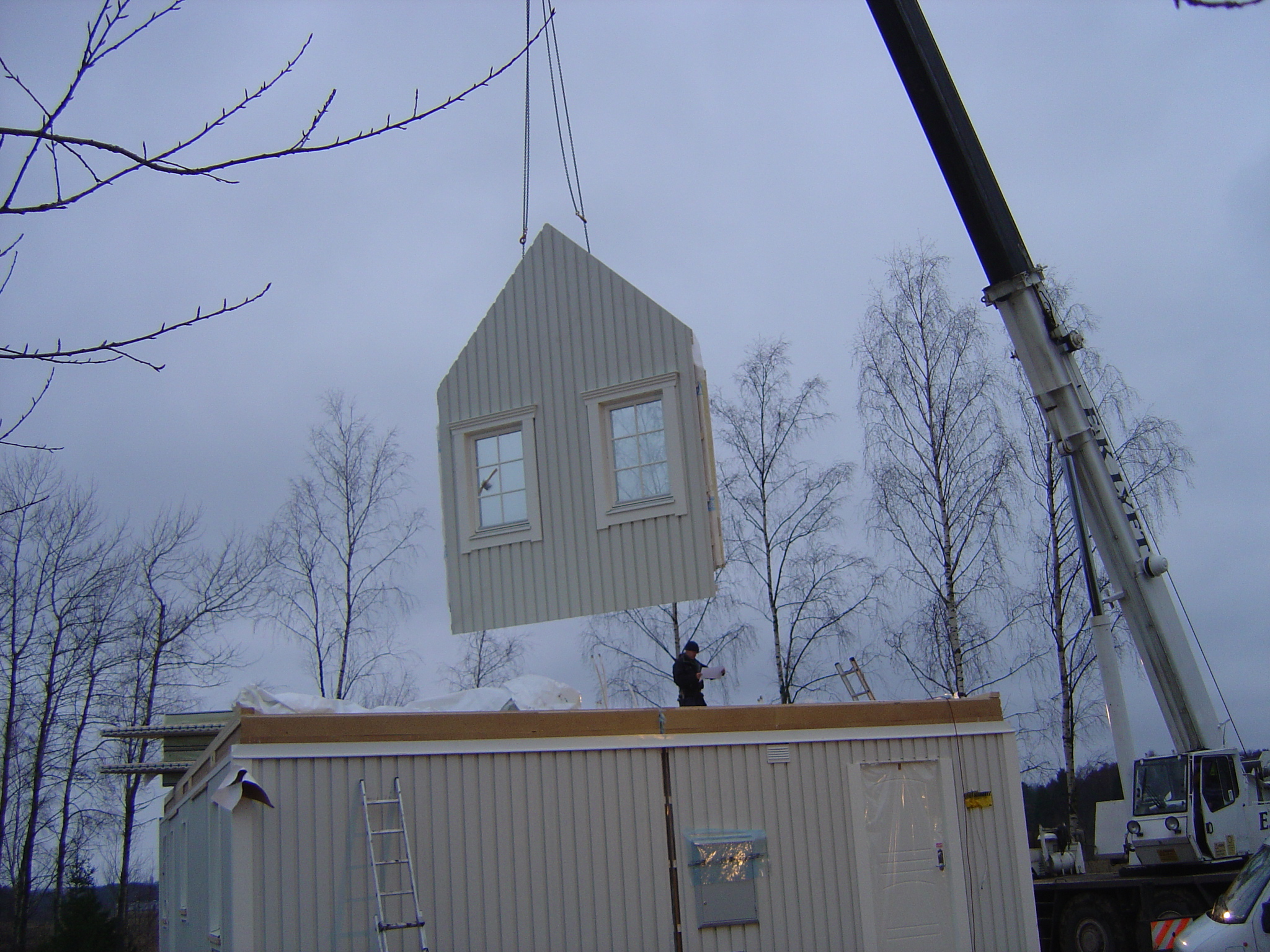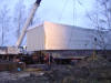 Två husdelar som skulle lyftas på plats |